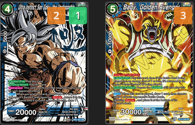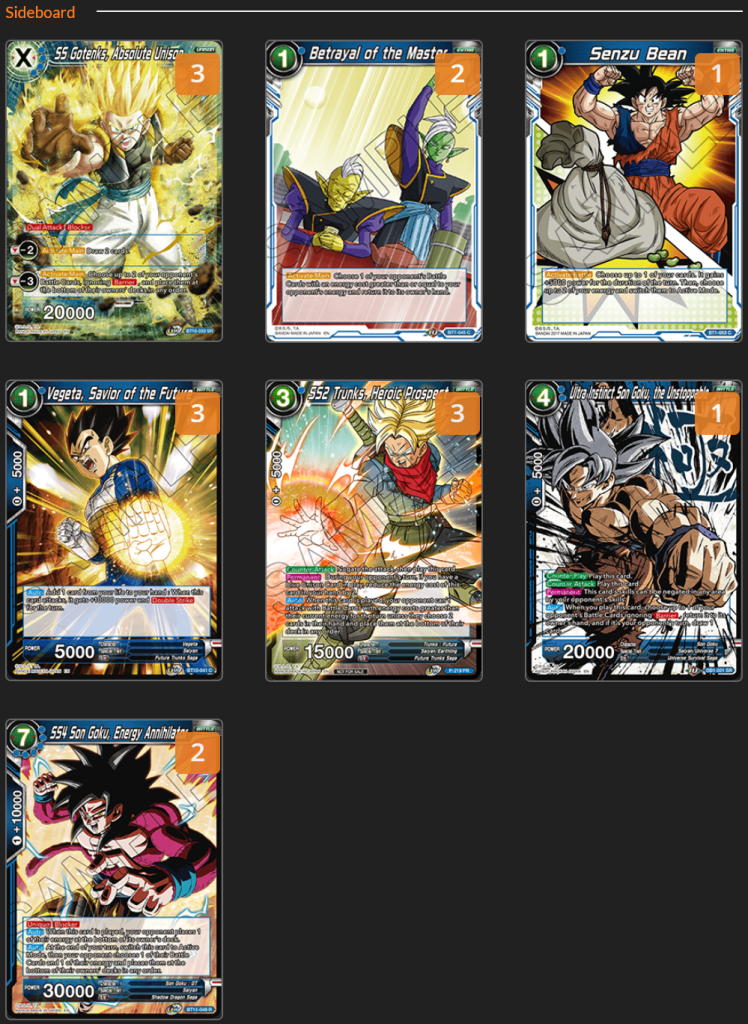 3rd Ultra Instinct Son Goku, the Unstoppable – Blue mirrors and decks that contain hard to address threats. If you have access to this card in those spots, it will be a huge swing in advantage for you. This is why we give ourselves the 3rd in the board.